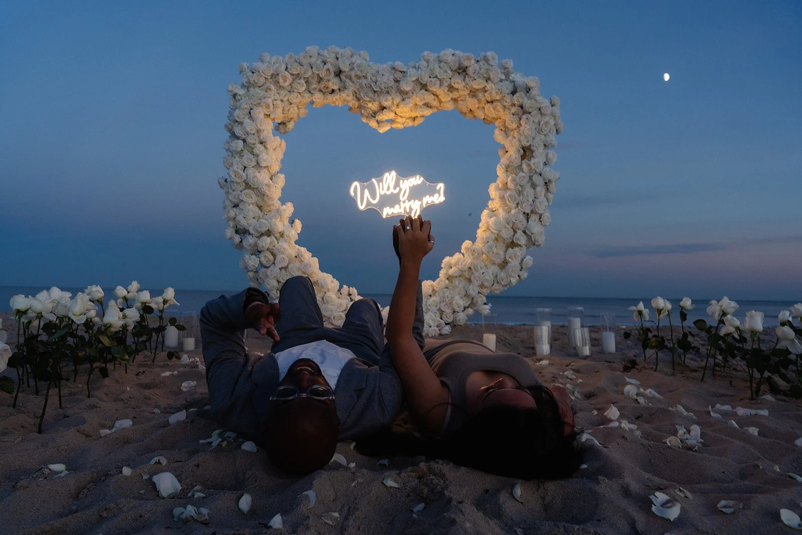 Heart shaped arch, neon sign, rose petal runway, assortment of candles